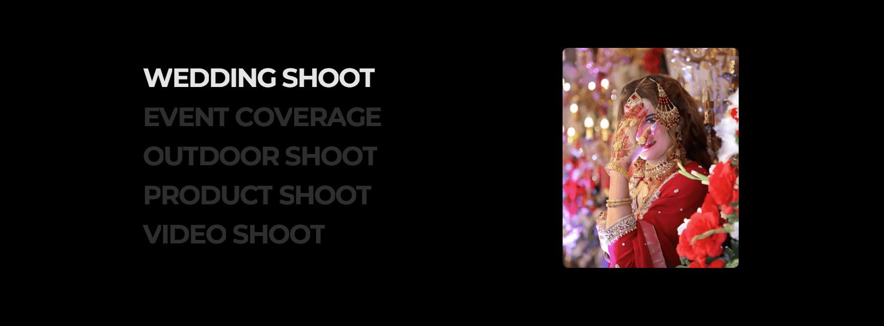 Showcases services: Wedding, event, and film coverage highlighted in dedicated sections.